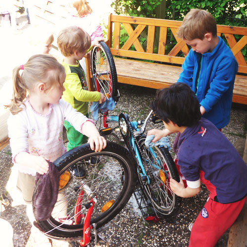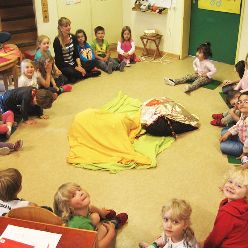 So kann es sein, dass eine Gruppe außerhalb des Kindergartens unterwegs ist, z.B. zur Stadtteilbibliothek, um nach Büchern zu einem bestimmten Thema zu suchen, oder um einen Tag im Wald zu verbringen oder auf dem