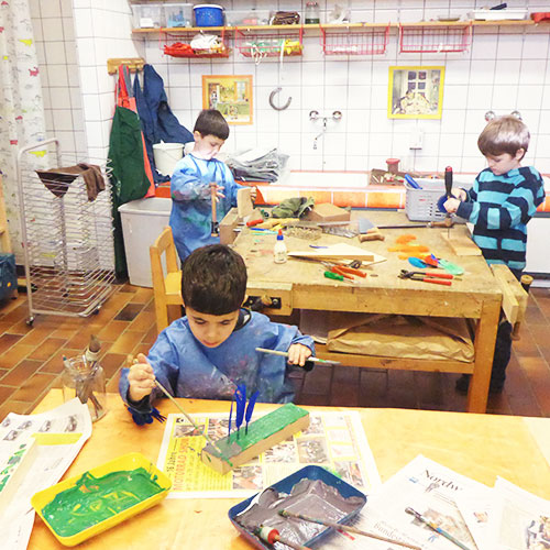 Kinder einer anderen Gruppe arbeiten in der Werkstatt am Bau ihres Holzfahrzeuges, auf dem mehrere Kinder fahren sollen. Die Materialien dafür haben sie zuvor mit einer Erzieherin in einem Baumarkt eingekauft.