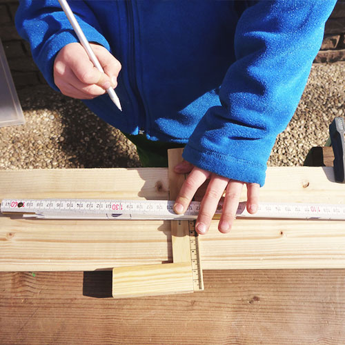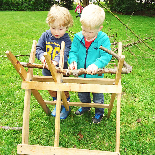 Jetzt wird abgemessen, gesägt, gebohrt, geschmirgelt und gehämmert. Kinder aus der dritten Gruppe setzen die Gestaltung ihrer Tonarbeiten fort oder gestalten aus gesammelten Ästen ein Kinderkunstwerk im Garten.