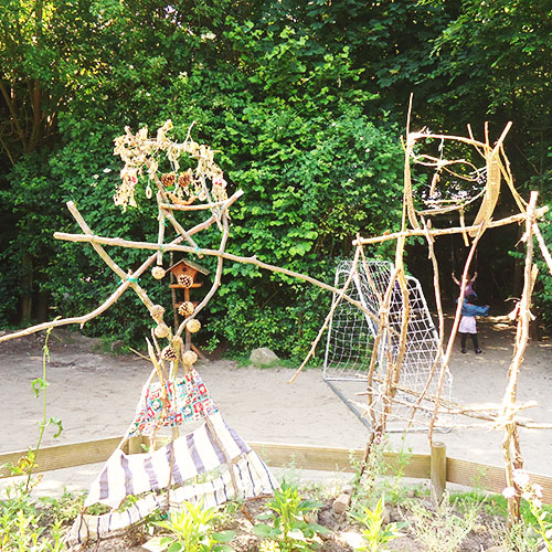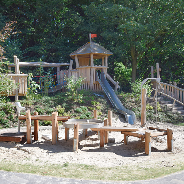 Das Außengelände mit altem Baumbestand ist naturnah gestaltet und bietet vielfältige Möglichkeiten zum Spielen, Erkunden, Entdecken, Forschen, Bewegen, Ausruhen ... Auf dem Gelände befinden sich ein Hügelbereich mit Rutschen, große Sandbereiche, Schaukeln, Spielhäuser, Klettermöglichkeiten, Ecken zum Verstecken, Flächen um mit Fahrzeugen zu fahren, ein „gestrandetes“ Boot und vieles mehr.